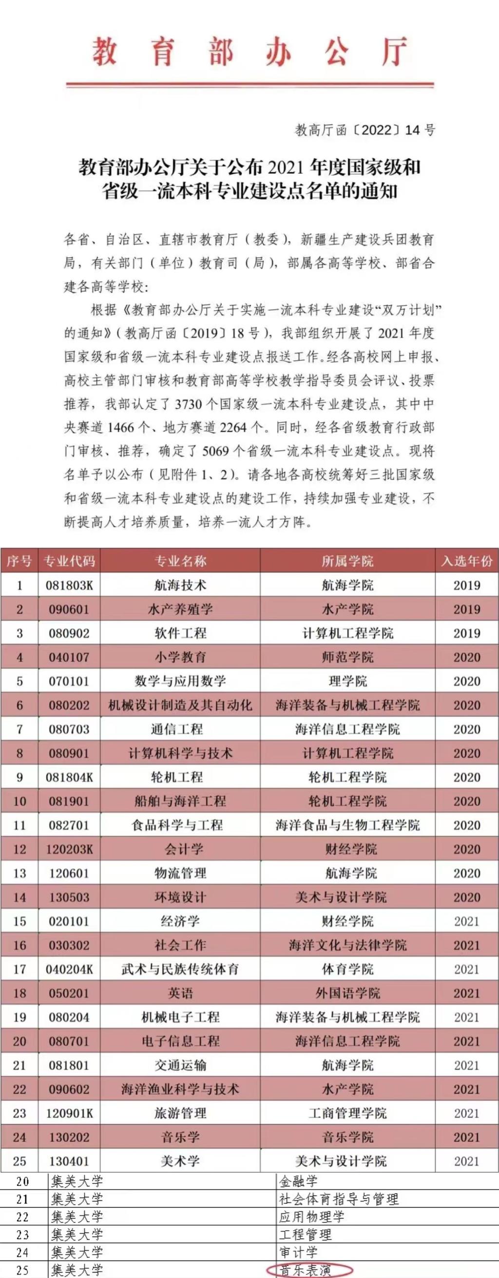 近日,教育部办公厅公布了2021年度国家级和省级一流本科专业建设点名单。我院音乐学专业入选2021年度“国家级一流本科专业建设点”,音乐表演入选2021年度“省级一流本科专业建设点”。