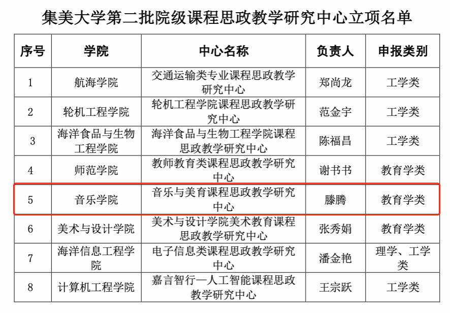 《音乐与美育课程思政教学研究中心(教育学类)》(项目负责人:滕腾),获批集美大学第二批院级课程思政教学研究中心立项。