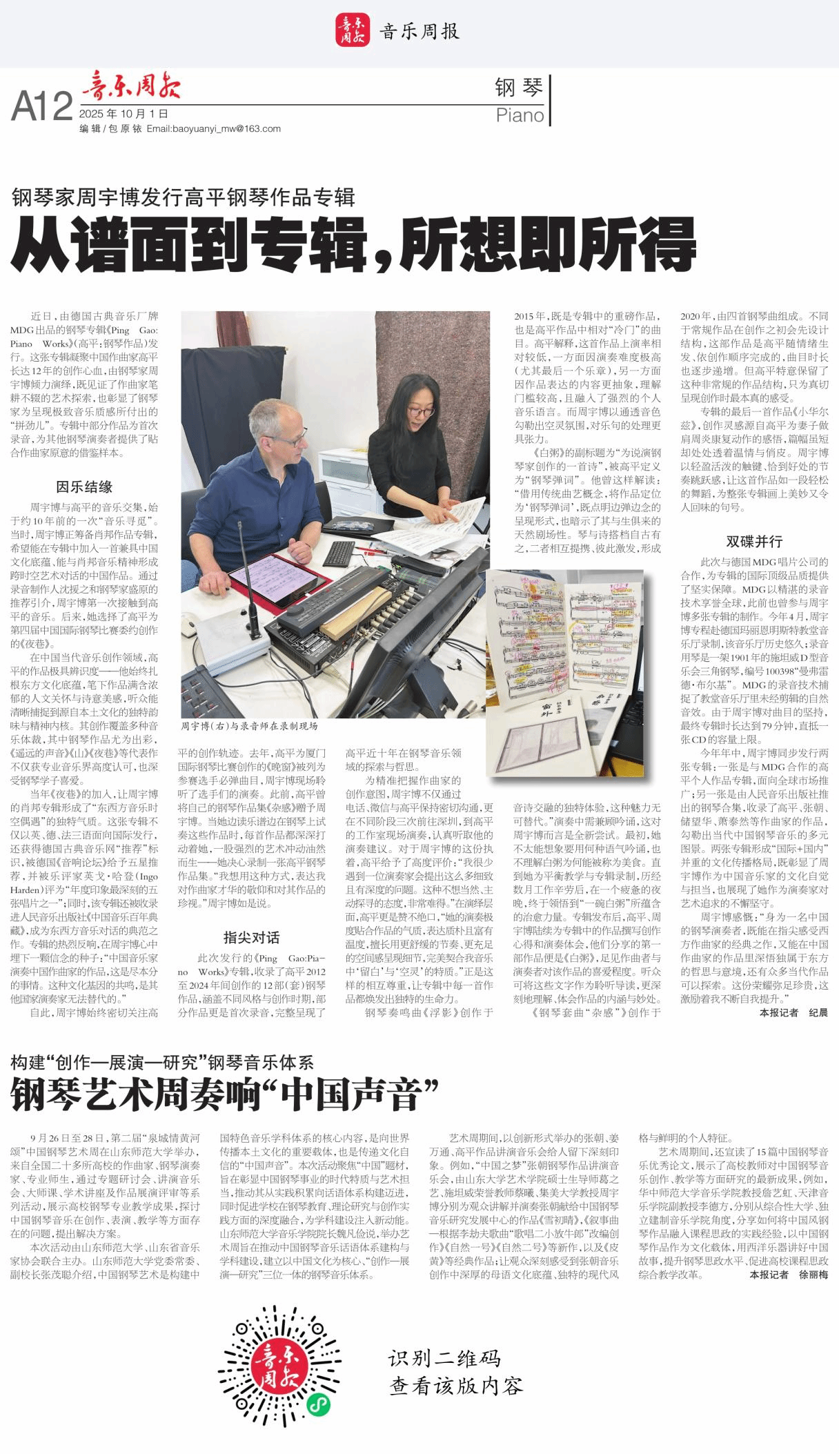 近期,我院周宇博教授同步发行两张钢琴作品专辑。一张是与德国古典音乐厂牌MDG合作的钢琴专辑《Ping Gao PianoWorks》(中国作曲家高平钢琴作品集),该专辑面向国际推广,其中部分作品为首次录音。另一张是由人民音乐出版社出版的钢琴合集,收录了高平、张朝、储望华、萧泰然等作曲家的代表作,勾勒出当代中国钢琴音乐的多元图景。