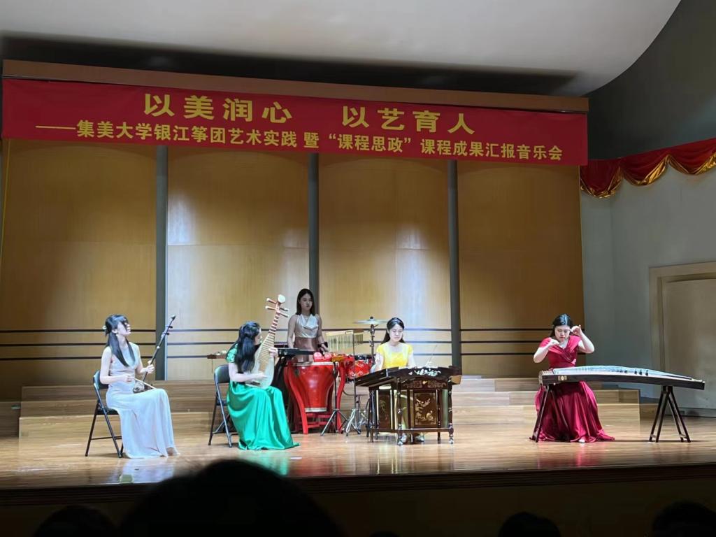 据集美大学音乐学院教授、硕士生导师陈萍介绍,作为校级课程思政示范课程负责人,她结合学校实际,挖掘学院特色课程“筝团艺术实践”中的思想政治教育资源,将美育与德育、智育相结合,让艺术专业课融入思政元素,受到了广大学生的欢迎。