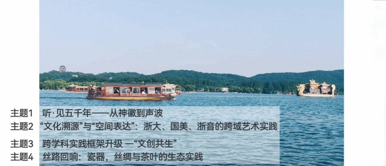 活动围绕四大主题展开——“听·见五千年”“文化溯源与空间表达”“文创共生”“丝路回响”,贯穿西湖、良渚文化遗址、浙江大学、中国美术学院(以下简称“国美”)、浙江音乐学院(以下简称“浙音”)等核心考察地。
