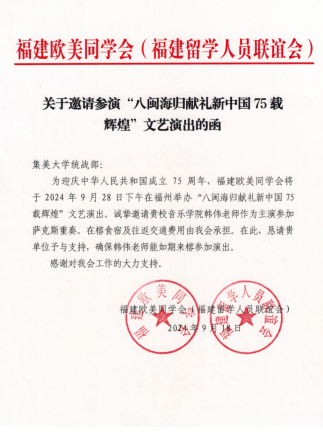 9月28日,音乐学院韩伟老师受福建欧美同学会(福建留学人员联谊会)的邀请,参加了福建归国留学人员庆祝中华人民共和国成立75周年活动,并作为主演在“八闽海归献礼新中国75载辉煌”文艺演出中进行了萨克斯管重奏节目演奏,为与会嘉宾们带来了他改编的世界名曲《火焰之舞》,展现了个人精湛的演奏技艺和卓越风采,表达了对伟大祖国的热爱与祝福。(图/文:韩伟,审核:李琬冰)