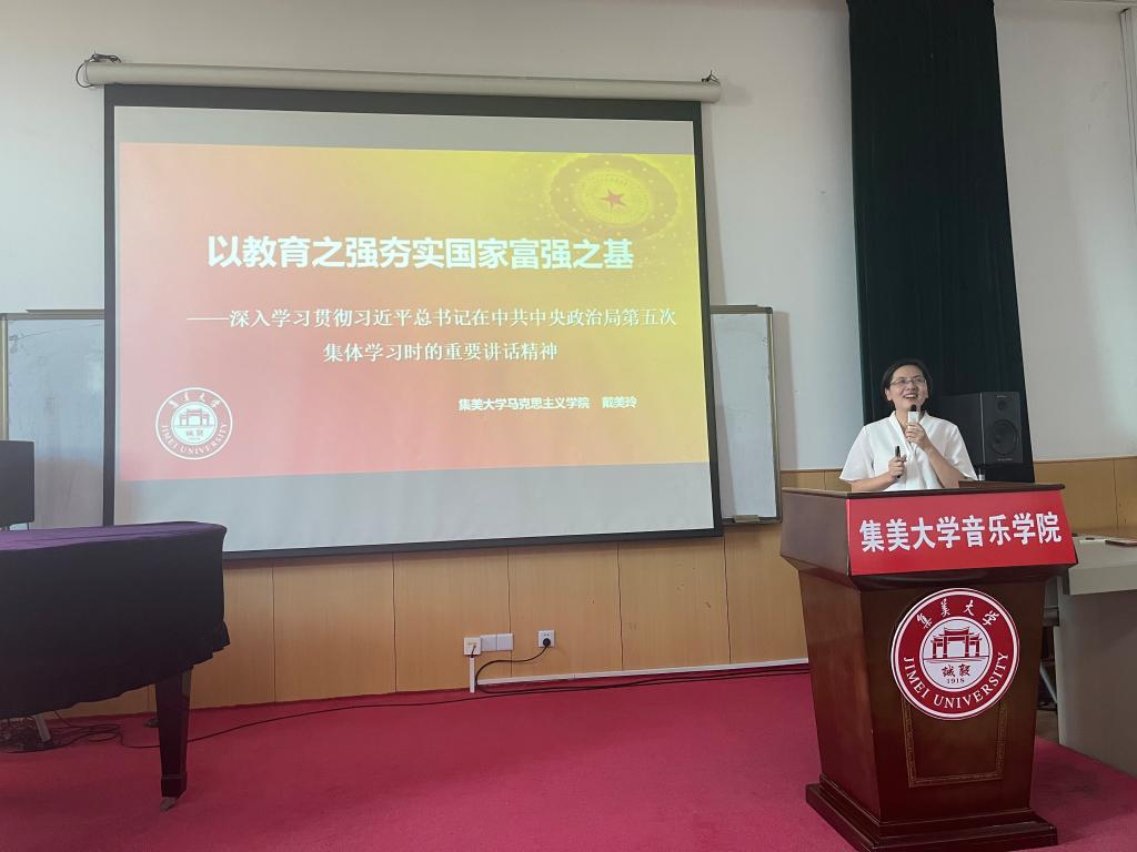 讲座以《以教育之强夯实国家富强之基——深入学习贯彻习近平总书记在中共中央政治局第五次集体学习时的重要讲话精神》为题,围绕基于讲话的文本分析和在教学中的几点运用开展宣讲。戴美玲从主动超前布局、有力应对变局、奋力开拓新局等三个方面对教育现代化建设如何谋篇布局进行了系统阐述,并鼓励学院教师结合音乐专业实际,切实提升教育服务国家重大战略的能力,为教育强国贡献高校力量。本次讲座内涵丰富,和教育教学工作深度融合,进一步推动习近平总书记关于建设教育强国的重要讲话精神在学院落地生根。