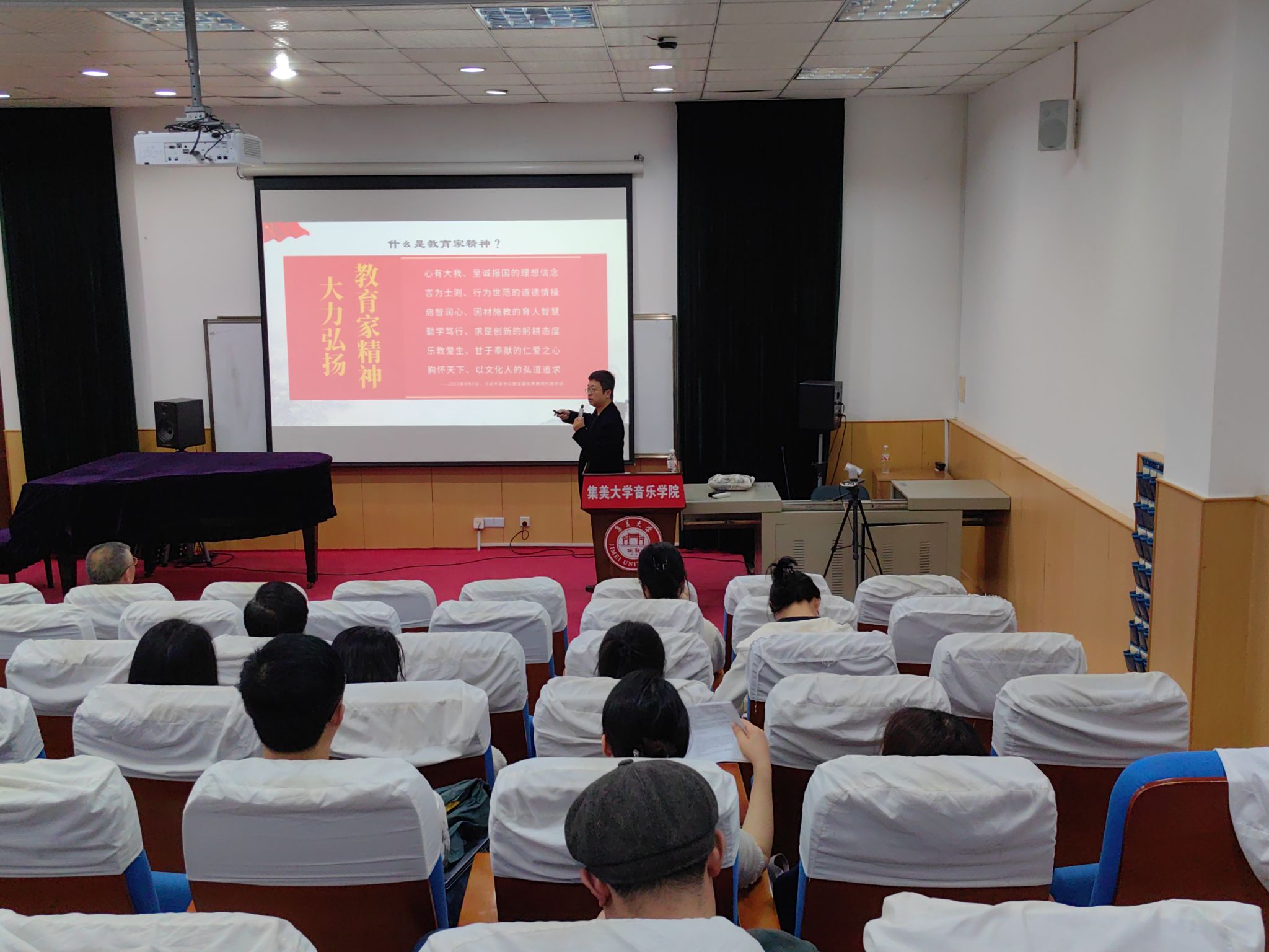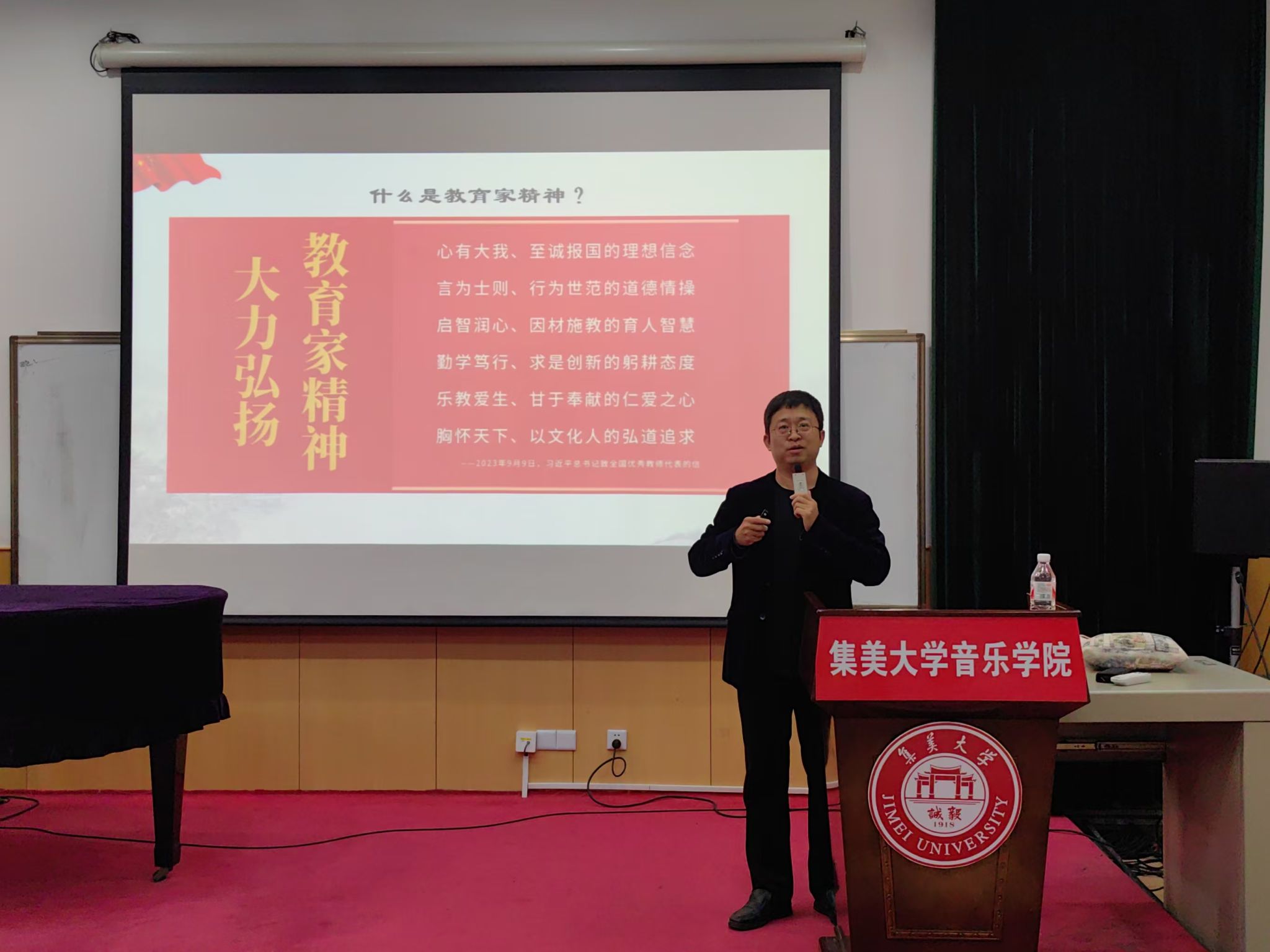 11月20日,音乐学院邀请校马克思主义学院董立功副教授作题为《大力弘扬教育家精神,引领福建教育高质量发展》的专题辅导报告。讲座由学院党委书记何治富主持,全体教职工、学生党员参加。